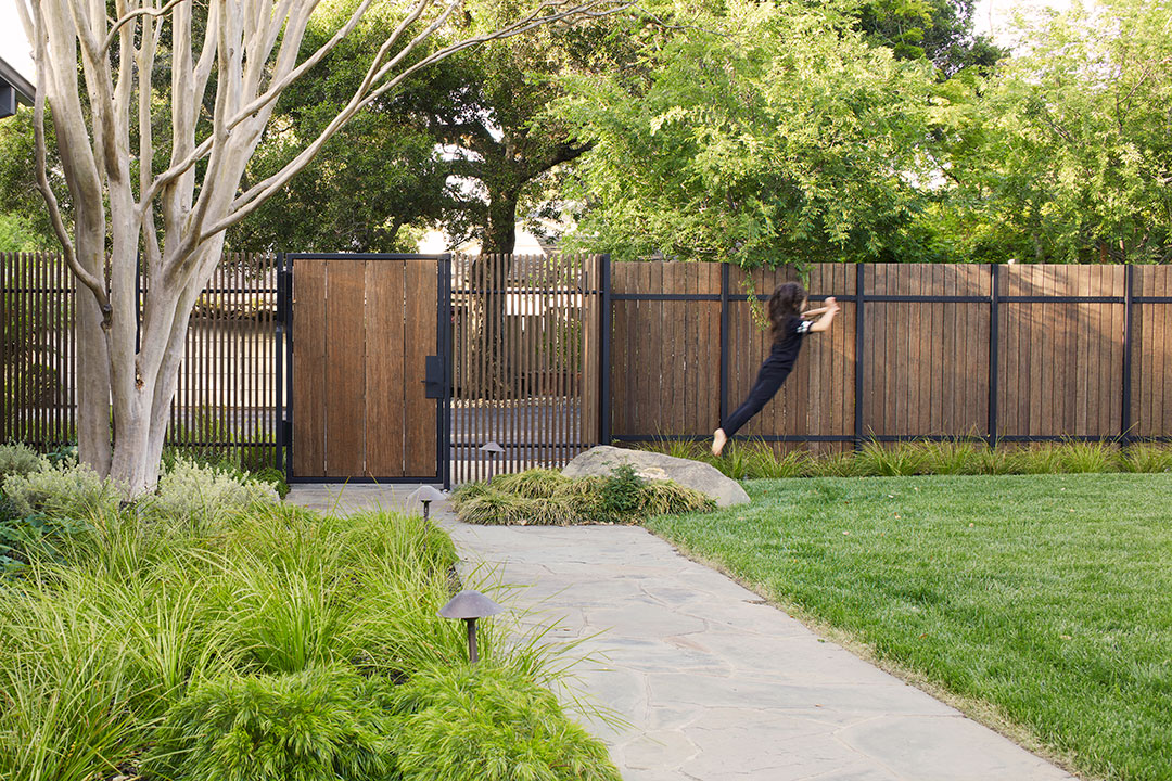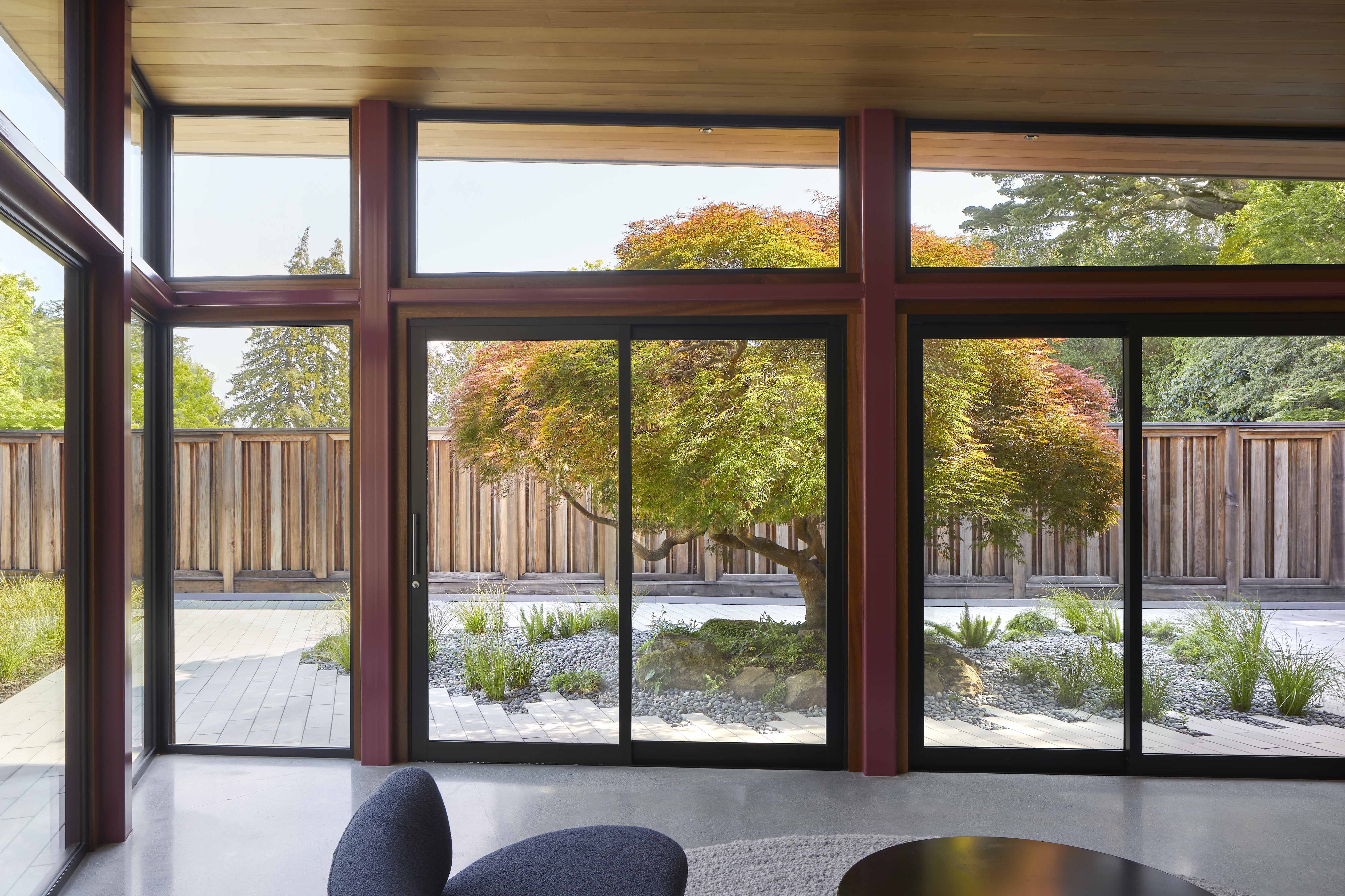 LanBreezy Garden transforms an overgrown property corner into an inviting courtyard that recenters the living spaces around the outdoor areas. Anchored by a majestic 50-year-old Weeping Maple, the garden restores and highlights venerable existing plantings while an overlay of new landscape elements carves out new pathways and boundary conditions. The spatial organization draws upon a study of the sightlines between the new ADU and primary residence. Existing melaleuca trees maximize the bedrooms' privacy and line the walkway to a formal rear entry. Beyond the maple, chartreuse Lomandra tops a sharp dry-stacked stone wall on the periphery of a grassy plane, contrasting with dark green mondo grass clumping around large boulders. Delicate Dogwood trees float within dainty blooms of Japanese anemones and cape rush reeds at the around the Main House entrance, providing a subtle counterpoint to the drama of the existing tree. Stone pebbles, ferns, and grasses create a textural landscape for the tree’s twisting trunk and branches and the drape of lacy, serrated leaves that turn a brilliant red in fall.