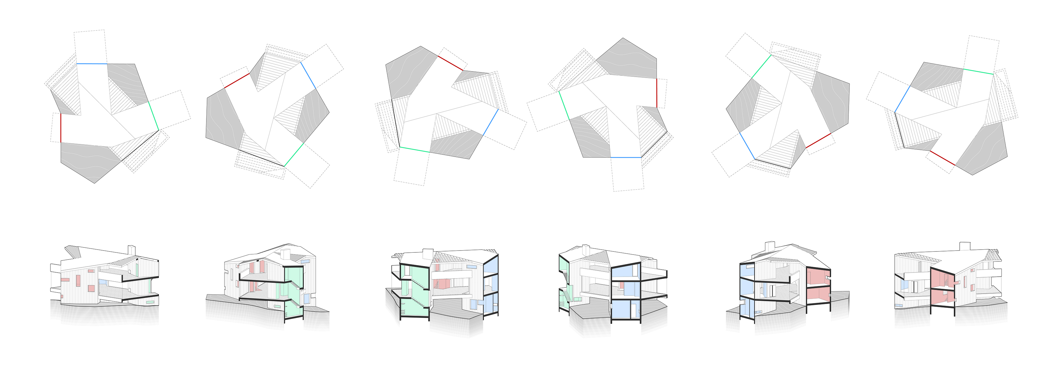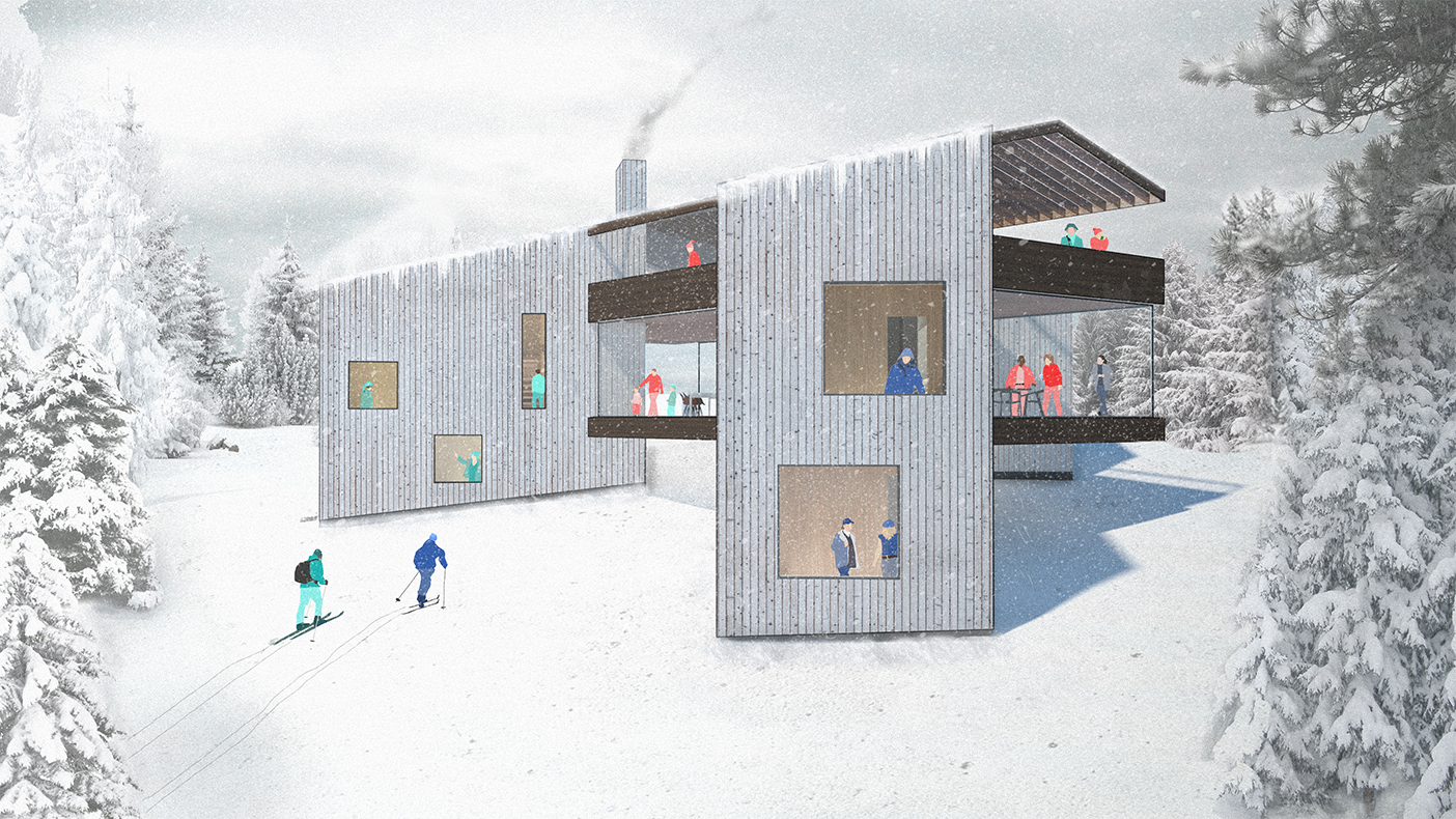 Lockwood BnBnB challenges the Single-Family (Vacation) Home type, proposing a structure capable of housing one, two, three, or more families simultaneously. Three guest towers support variably linked common spaces, allowing a year-round choreography of inhabitants who effortlessly commune or retreat, creating a moment of density in a vast mountain landscape.