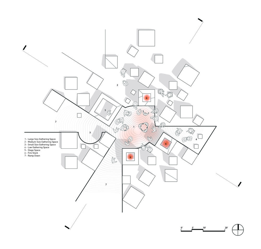With each season, a new group of workers will be trained and the pavilion will grow to incorporate new gathering spaces. The structures are arranged to create an iconic, mountain-like form rising out of flat horizon of the Pow Wow grounds, providing a shaded area in the hot summer months, and a warm fireside shelter in the winter. Upon approach, the mountain form dissolves in to discreet objects, defining gathering spaces of many sizes suitable for storytelling, meetings, performances, parties, markets, play, exploration, and quiet repose.