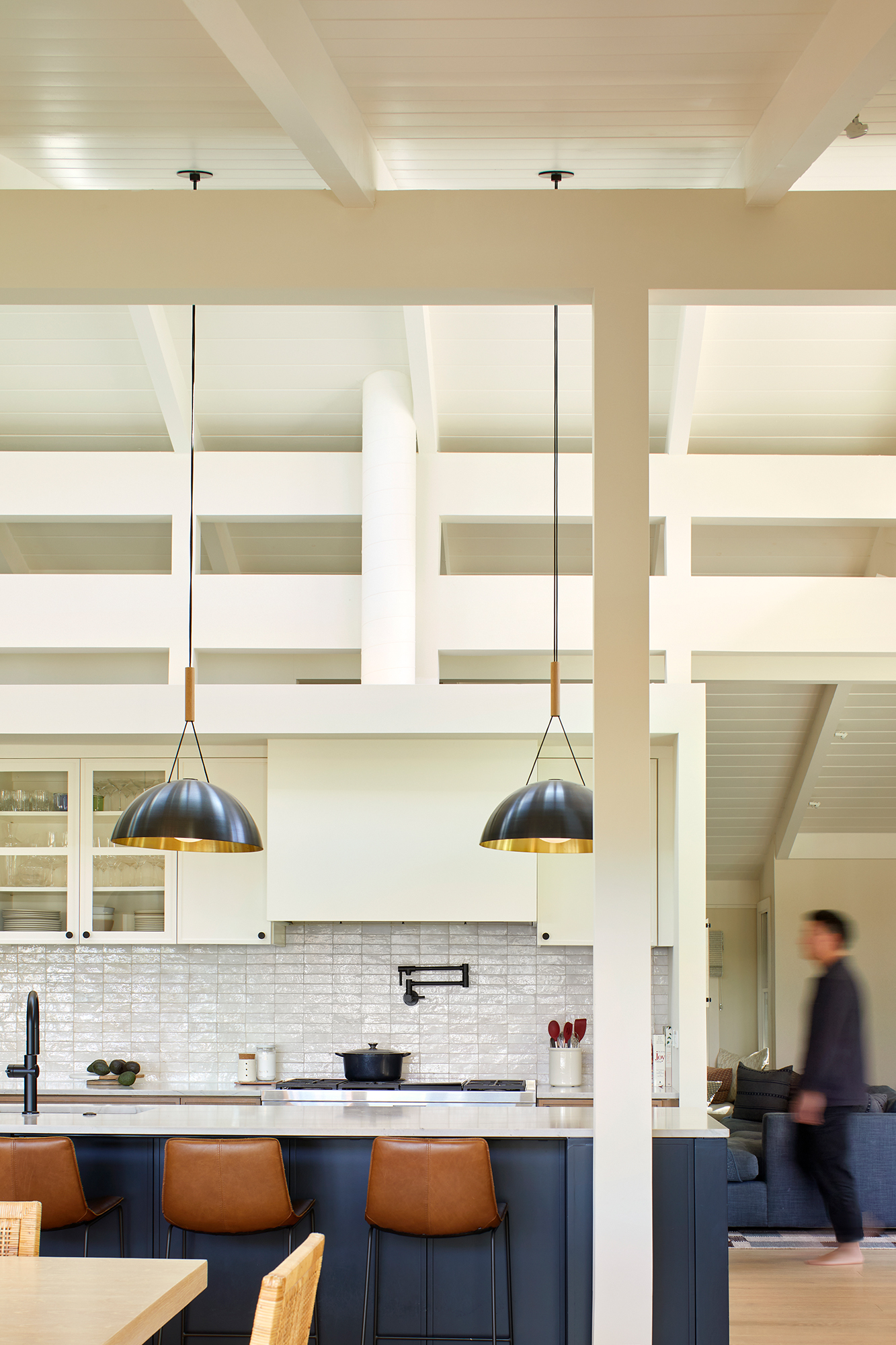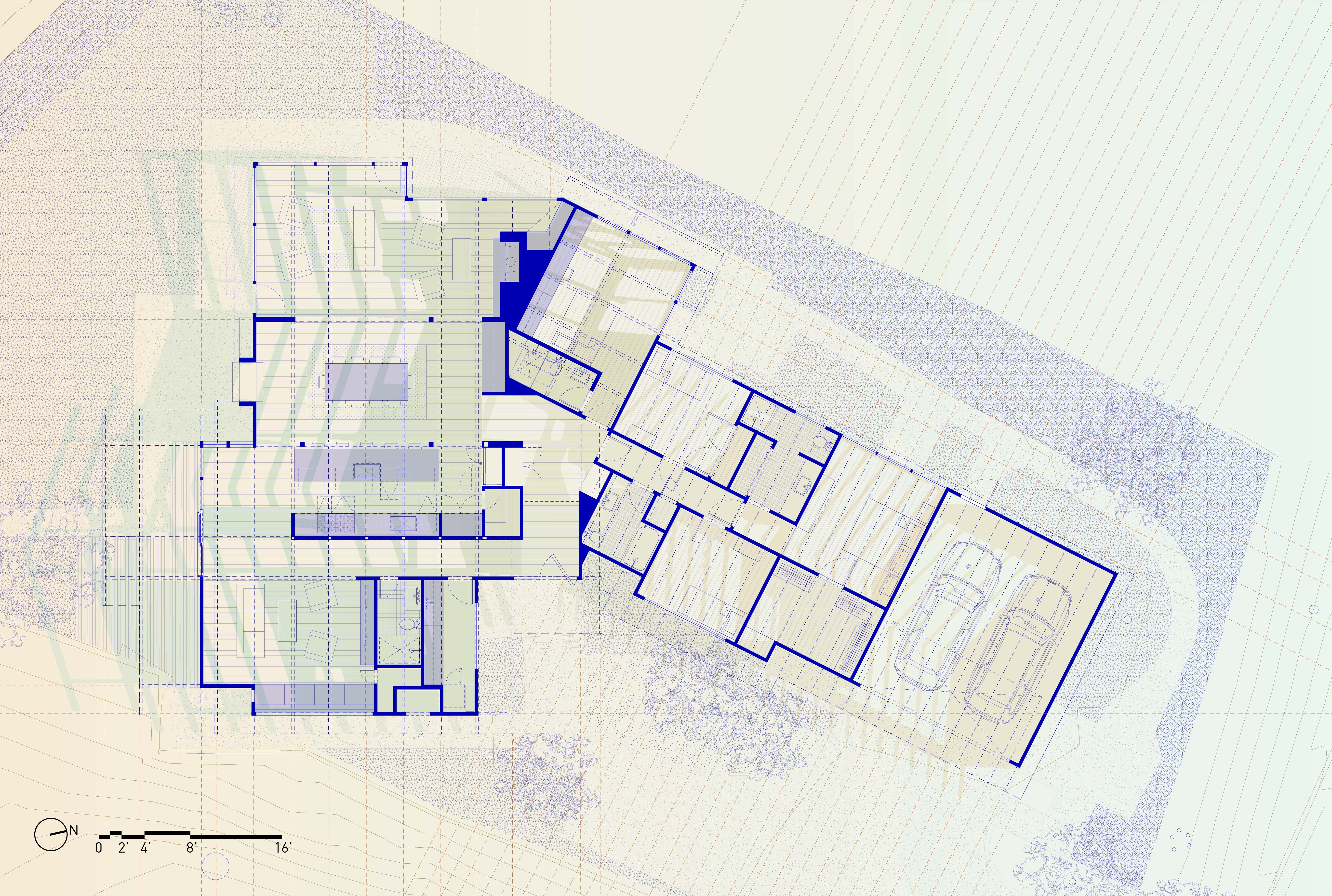 SAW first approached the house years later and noticed a latent potential of the structure, not in the floor plan necessarily, but in the ceiling plan. This newer fold, and the fold that had preceded it, were full of grain, expressing the tectonics of boards and beams across different slopes. In this interior renovation, SAW decided to delete as many heavy partitions as possible, turning the roof into a floating wave, woven with layers of existing structural strands and new ones, favoring depth within a structural field over rooms and volumes. New skylights between the rafters, voids within the walls, and bars of program create a gradient of domestic spaces, animated by the changing angles of the sun. Circulation is directed along the roof axis, bringing order to a kinked plan geometry. The spaces now direct the heart of the house toward the spectacular views of the hills and valleys beyond. The rafters tell the tale this house, held apart and amplified just enough to tie things together.
